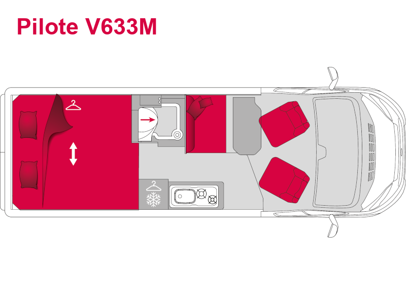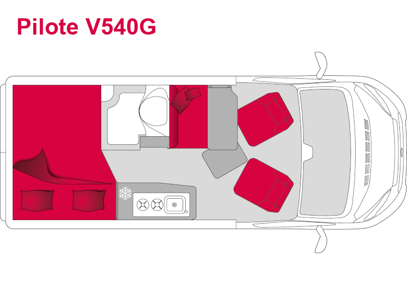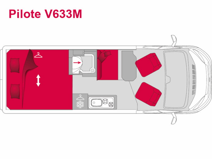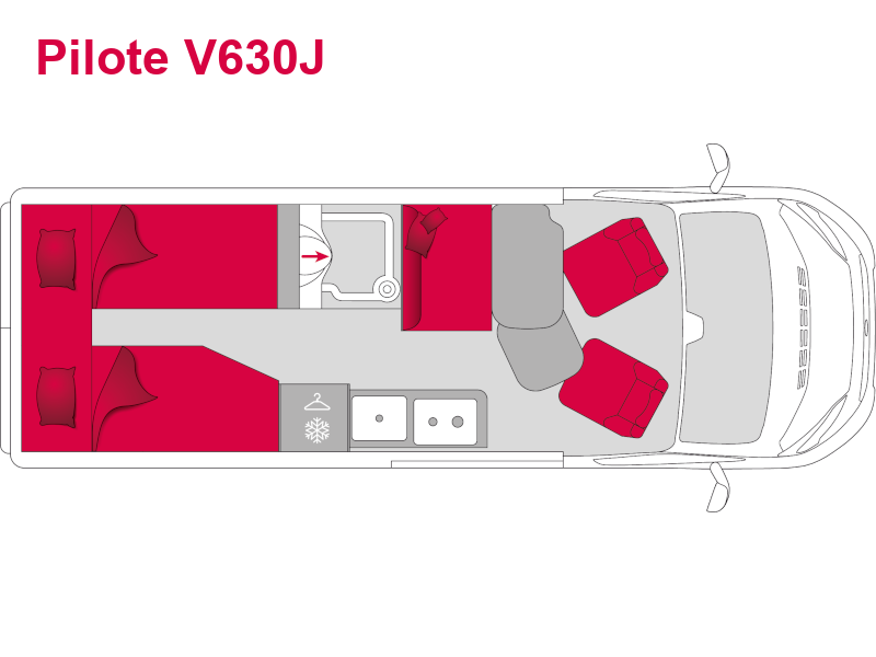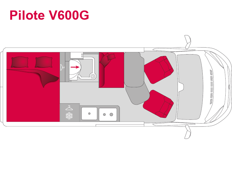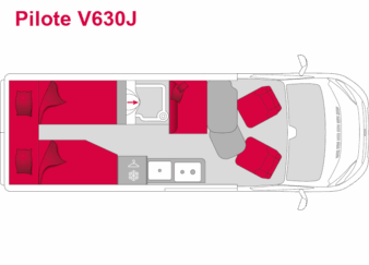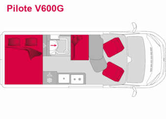 Pilote V600J je speciálně navržena pro dvě osoby. Jeho zadní dveře bez oken zvyšují komfort spánku tím, že poskytují naprostou tmu. Jídelní kout je optimalizován posuvným stolem a praktickými úložnými prostory.
